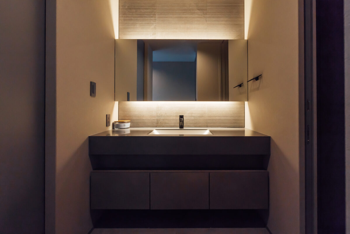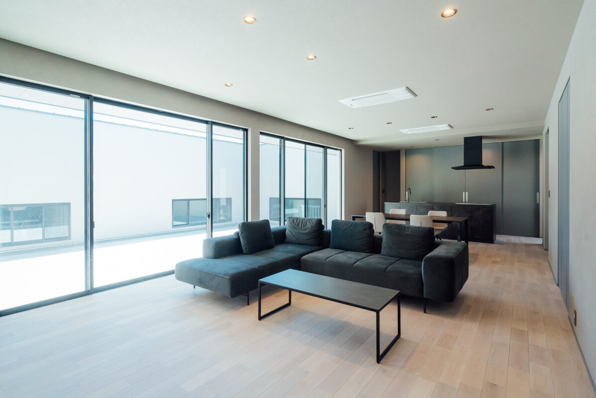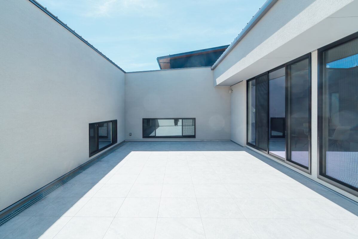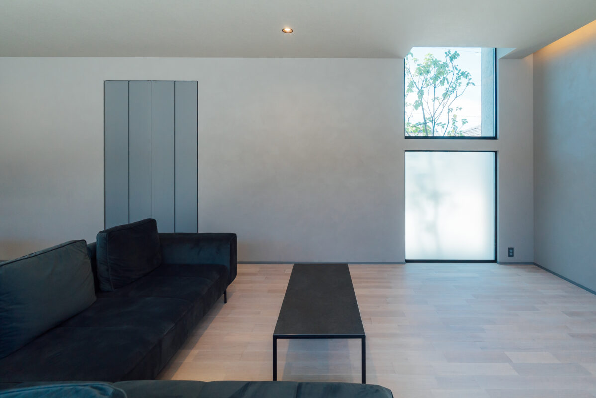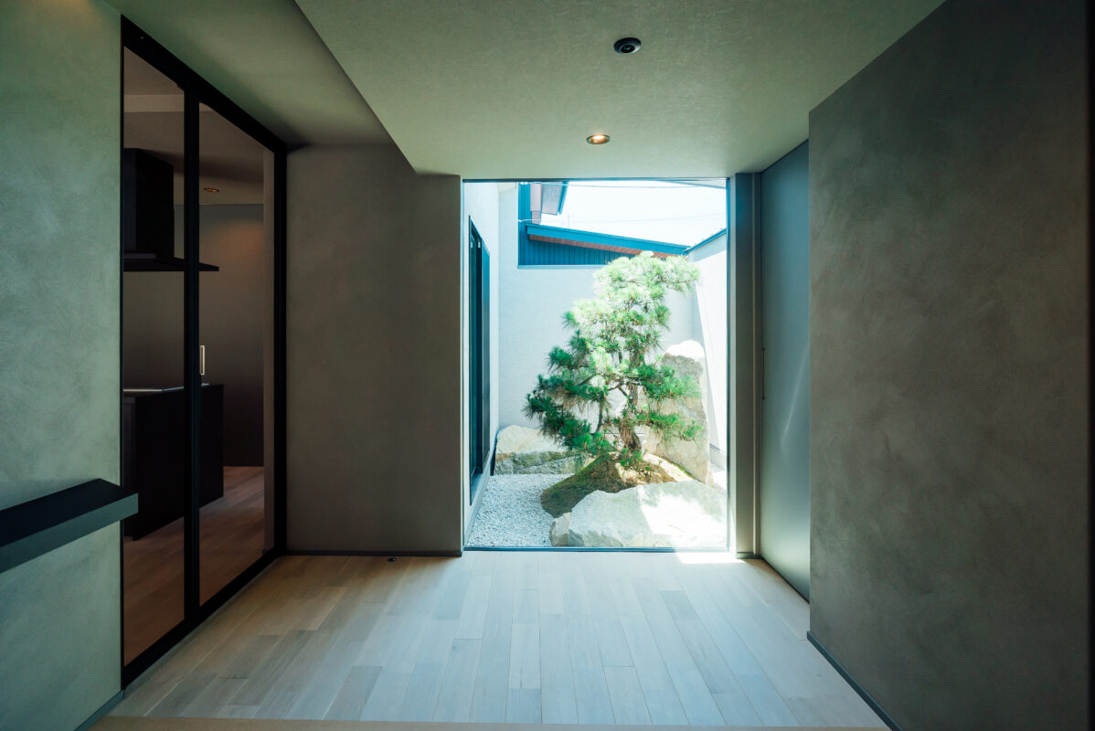 高低差を活かしたインナーガレージ+プライベート中庭のグレーの平屋